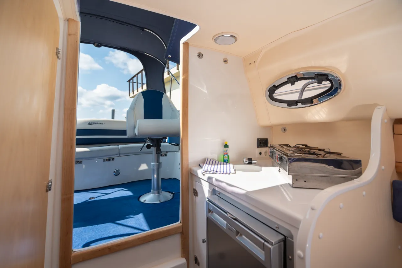 Unsere neue Aqualine 690 „Mia“ ist eine sportliche Yacht, die sich für Wochenendfahrten und Tagesausflüge bestens eignet. Im Vorderschiff sind neben den Salonbetten eine Küche mit Herd, ein Kühlschrank und der Toilettenraum vorhanden. Im Cockpit befinden sich neben einer bequemen Couch zwei Fahrerstühle, die zur großen Sitzecke freigedreht werden können. Das Boot besitzt ein Bugstrahlruder welches das An- und Ablegen erleichtert.